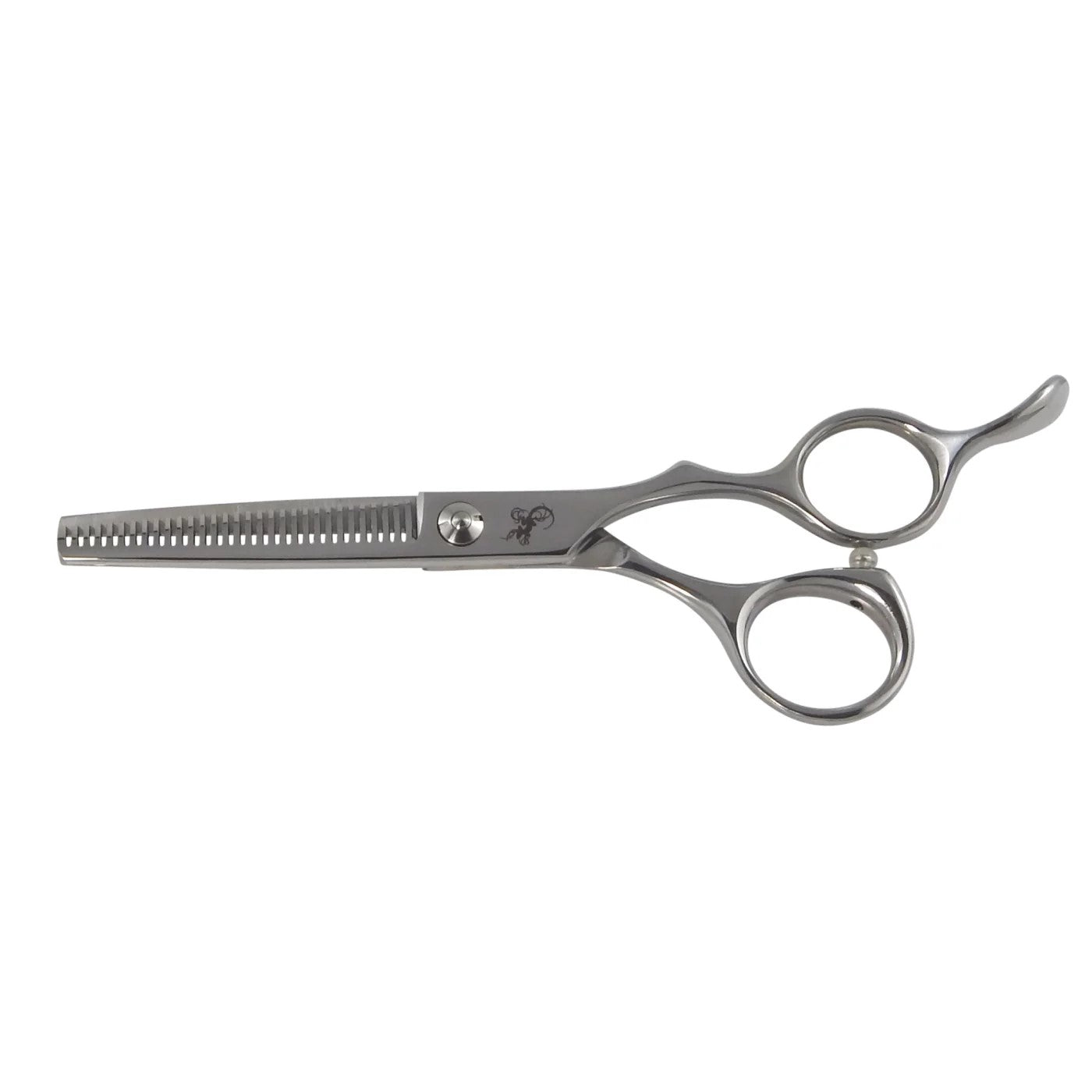 This scissor features an ergonomic semi-offset handle for comfort around the thumb. Its molded finger rest ensures hand stability. Removes 50% of hair with its v-shaped teeth.